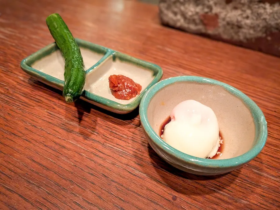 この日のお通しは『田舎のきゅうり』と『名古屋コーチンの温玉』です。