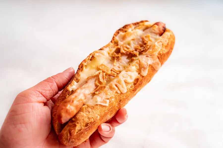 こちらはザクっと食感のフランスパン生地に、ソーセージがどん!と乗り、 下には刻まれたピクルス、上にはチーズとフライドオニオンも。