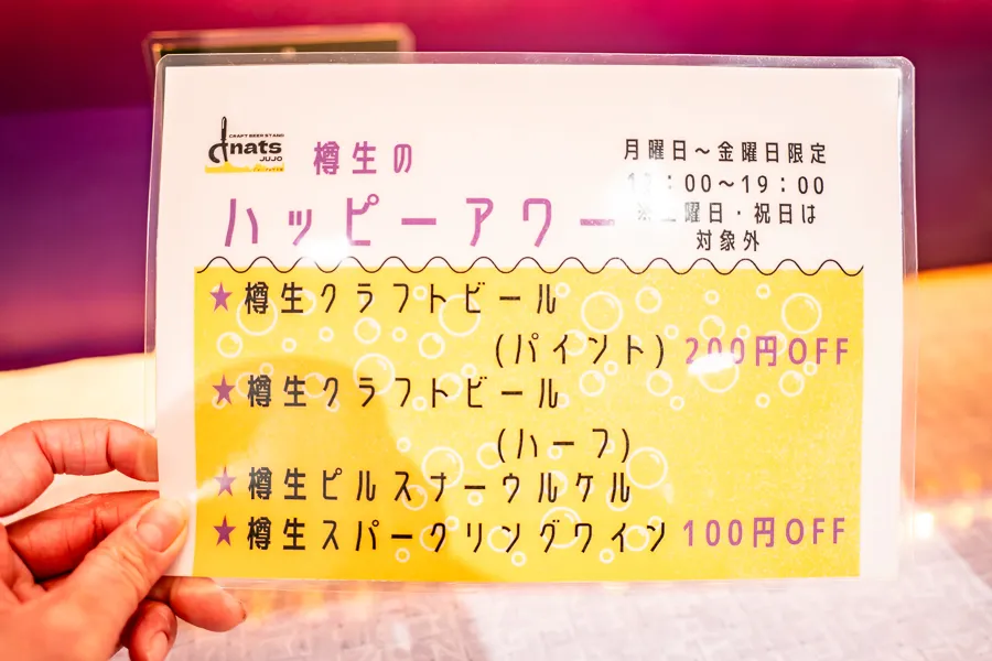 平日限定で、19時までの注文はハッピーアワーとしてお得に楽しめるのもとっても嬉しいポイント! クラフトビールのパイントサイズ(480ml)は200円OFF、クラフトビールハーフサイズ(260ml)・ 樽生ピルスナーウルケル・樽生スパークリングワインは100円OFF。