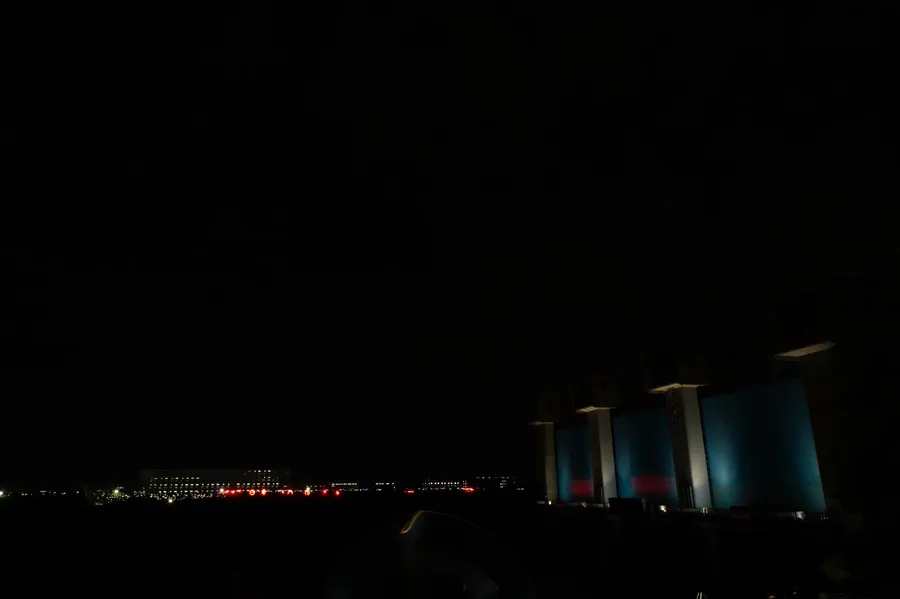 ドローンに呼応するように、ムービングライトも空を照らします。
