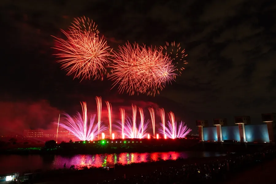 ライトアップされた歴史ある岩淵水門と花火、北区を代表するイベントに相応しいシチュエーションです。
