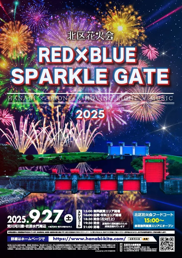 北区花火会のキャッチコピー「RED×BLUE SPARKLE GATE」の文字が浮かび上がると…。